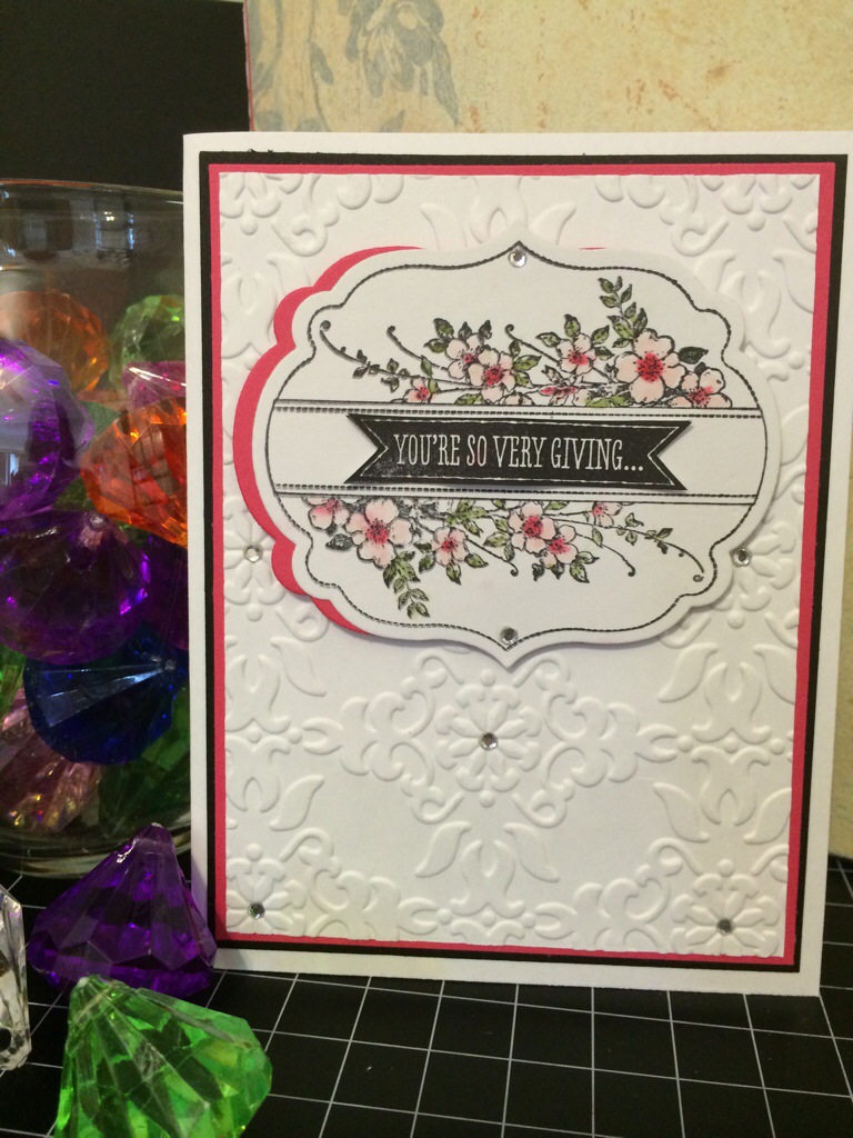 Sorry, but this post was suppose to have been posted yesterday but something went wrong so I’m re-posting it. I have a Tutorial on this card at my YouTube channel if you’re interested in that. This cards I used Apothecary Art stamp set which is still in the new Catalog. I decided to do a Stampin up video every Monday whether with New or Old Products! Sorry that this wasn’t posted on the right day. I used black, strawberry slush and whisper white card stocks.
