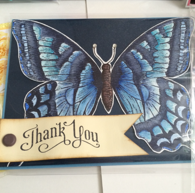 Today I wanted to share with you this Watercolored Swallowtail Stamp set from Stampin Up. I used several different Blues to color after I stamped it out in watercolor paper using stazon. I really love the detail in this stamp set, it’s absolutely gorgeous. Very simple card! I hope you enjoyed this picture, and please subscribe for more inspirations and ideas. Thanks so much!