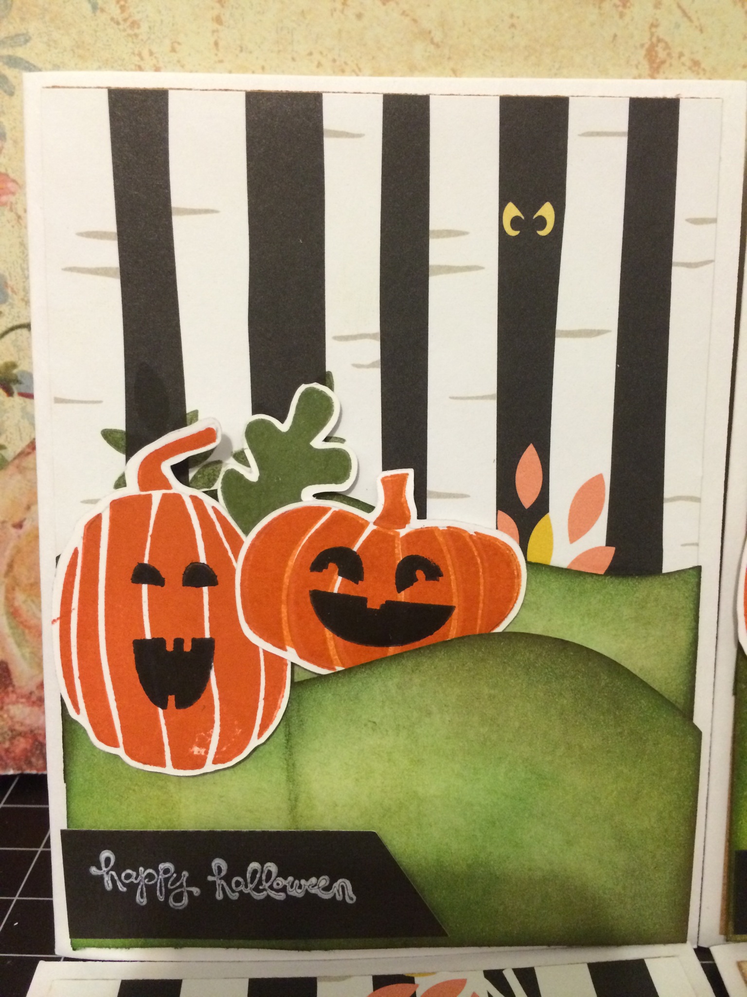 Today I’m sharing this card using Fall Fest stamp set and the Montly Monsters DSP. This design of the DSP was a perfect paper for this cards background so I took advantage of the paper and used it as a forest. I stamped out 2 sizes of the pumpkin and the ghost and cut it out with the matching framelits. I embossed the ghost using the Ultra Thick embossing powder to give it more dimension. I cut the hills out freehand and distressed it using several different cord to achieve the look I want. I hope you like this card and you can visit my YouTube channel to see a tutorial for this card. Thanks so much as always and please subscribe for more inspirations and ideas!