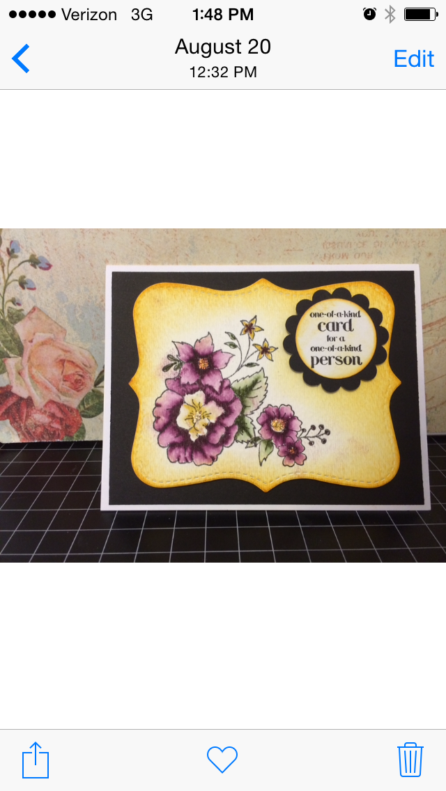Today I have a card I made using Stampin Up’s Hostess stamp set called I Like You. I also used our Stampin Up Markers like I would with alcohol markers. The colors I used are Blackberry Bliss, Mossy Meadow and Hello Honey. I stamped out the image on 140lb Strathmore watercolor paper using Stazon jet black. I cut the watercolor paper using the Stampin Up’s Top Note die and distressed the edges using Wild honey distressed ink.