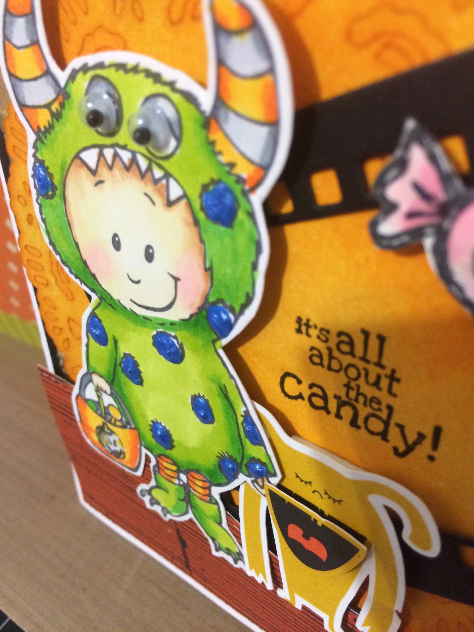 Today I’m sharing this card I made using this super cute digital image from Gerda Steiner Designs. I purchased the digital image but she offered rubber stamps as well. I printed him out on Neenah Solar White and used my Shinhan touch alcohol markers. I used a Blue Puffy paint on the dots of his costume. I used a doily that I cut out using my Cricut but as you can see it didn’t cut all the way through but it worked out for this card. I also cut out a black film strip piece using my Stampin Up framelits. Black piece of paper measures 4″x5 1/4″ and used a Cuttle bugs embossing folder which I don’t have the name for because I threw away the packaging. I put everything together and this finished my card for today. For a complete tutorial for this card, please head on over to my YouTube channel. Thank you so much for visiting and please subscribe for more inspirations and ideas. Thank you!