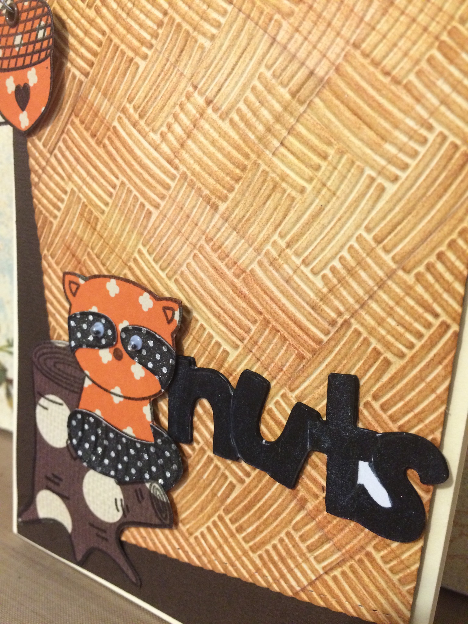 IMG_7150.JPG Aloha Guys! Today I’m sharing a card I made for MFT Sketch challenge #195. I made a card like this last week for Newton’s Nook’s Challenge but this is sketch for MFT this week so I’m making another one, like it. Today I’m doing paper piecing. I have so many 12×12 papers that I couldn’t even buy New design papers that are coming out because I have no room to put them. 12×12 papers are good for scrapbooking but for card making its just too big so you end up with bunch of scraps left over!! I’m going to try my best to use more design papers even though I Love to make my own:( Anyways…I stamped out these critters from one of their New Release, Cute Critters on several different design papers and embossed it all and fussy cut them out. I also stamped out the word Nuts and used my Scan N Cut to cut multiples and glues them together to give more demention to this word. I cut out a large stitched rectangle using the Lawn Fawn’s large stitched rectangle stacks, which took forever to receive by the way because they were either sold out or back ordered! I cut the rectangle out from wood grain design paper and ran it though my Darice embossing folder to give more texture. I distressed this panel with Tea dye distress ink and adhered it down on a early Expresso card stock measuring 4″x5 1/4″ on a slant since this was the sketch. After doing that I punched a hole on the top left corner using my 1/8″ hole punch and put a hole brad(I forgot the name) and I did the same for the 2 acorns I fussy cut. I’m going to use it as a charm dangling from the corner. I attached that entire panel with foam dots onto an A2 size very vanilla card base. I put all the pieces together and that is my card for today. I hope you like this card and ease subscribe for more inspirations and ideas. I have a full tutorial for this card on my YouTube channel if you’d like to check that out. Thanks so much for visiting and have a great day.