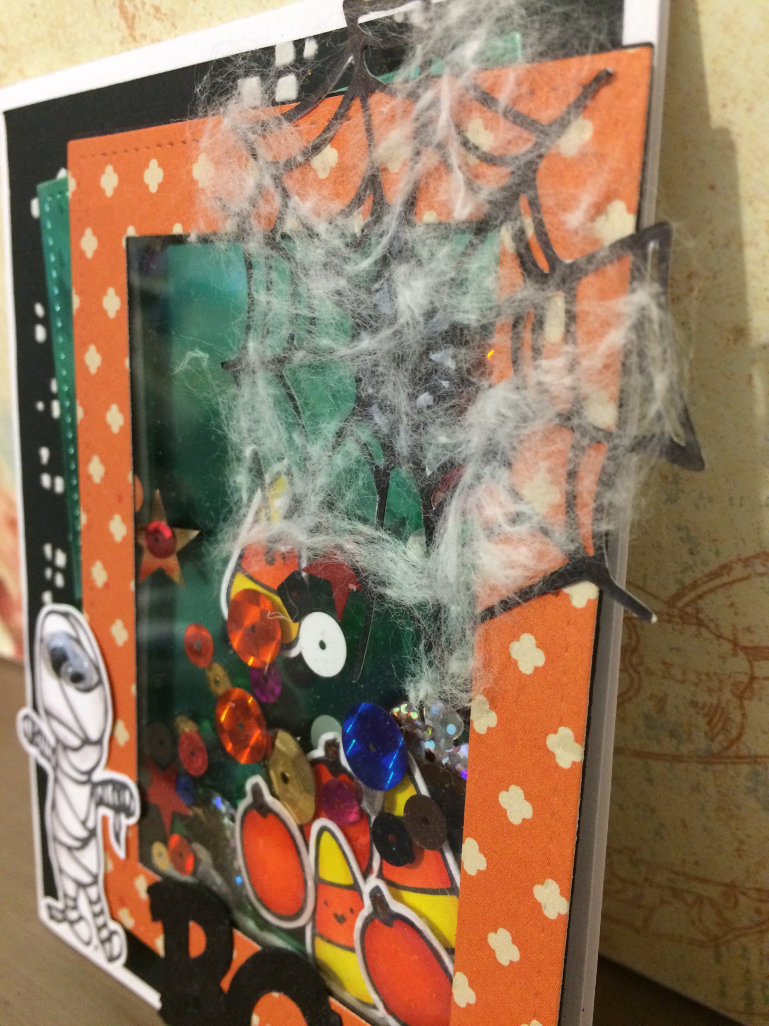 Today I’m sharing a card I made for The Alley Way Stamps Be Inspired Challenge #58. The theme I chose for this card is to replicate a mirror but a shaker mirror. I cut out 5 pieces of rectangles 4 of them being like a frame using Lawn Fawn’s stitched rectangle die. I cut 3 in black and 1 in patterned paper for the frames and 1 in shinny card stock and I didn’t but the centers like I did for the other 4. I used the Stamp set called Ghouly Friend and stamped the mummy, candy corns, pumpkins and the spider web. I used my Scan N Cut to cut the spider web because I wanted it to cut not only the outside but the insides as well. It didn’t completely cut all the centers but it was ok. I just colored the portions that didn’t cut using the American Crafts glittered gray markers. I also cut out a acetate for my shaker card. I got a piece of black cardstock measuring 4″x5 1/4″ and used the Tim Holtz stencil and put embossing paste and let it dry completely and attached it to my A2 size white card base. I attached all 4 of the frames together putting the acetate in between. I colored the mummy with my Shinhan touch marchers using W1, W3 and the colorless blender and put some Googly eyes on the mummy. For my little pumpkins I colored it and put ultra thick embossing powder to give a shinny look to it. I placed the candy corns, pumpkins and sequins inside of my shaker part to create my mirror look. On the spider web, I put some cotton balls stretched out to make it look more like a spider web. I attached the mummy and my sentiment, Boo and this finished my card. I have a full tutorial for this card on my YouTube channel if you’d like to check that out! Thank you so much for visiting and please subscribe for more inspirations and ideas. Thanks again!