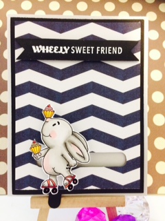 Today I’ve made a card using Gerda Steiner Designs Roller Skating Bunny.  I’ll put the link below if you’d like to check it out.  He is super Cute!! As soon as I saw him, I knew I wanted to make a Slider card.  I’ve made a standard A2 size card and I cut a Silver Shimmery card stock at 4 1/4″x5 1/2″ to cover the entire card front.  I also cut a black Bazzil card stick at 4×5 1/4″ and a Chevron design paper at 3 3/4″x5″.  I printed the bunny out on Neenah Solar White card stock and colored the bunny using my Copic Markers.