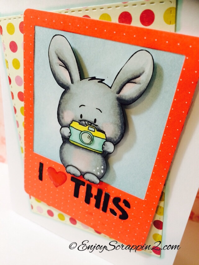 Today I’m making a card for Gerda Steiner Designs June/July Challenge card for the DT. Gerda has a Progressive challenges every month and if you are not familiar with her challenges, here is change for you to get Free images every month. Gerda’s progressive challenge is, you buy that months challenge image . You use that image to participate in her challenge, then next month she’ll send you the Next months Image for Free. Yes, Free. As long as you participate in the challenge, you’ll be getting an image every month after that. Pretty Amazing!! Great chance to collect these adorable digital images. So for the month of June and July it’s this Say Cheese Rabbit. He’s super adorable!! This image is not only perfect for cards, it’s also perfect for your scrapbook layout as well as for pocket letters.