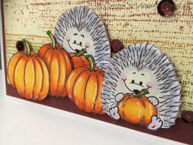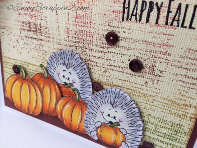 Today I’m coloring some pumpkins. I am using Gerda Steiner Designs Digital Images as well as Happy Fall Clear stamp set. The pumpkins came from the Halloween cats and more and I also printed the hedgehog with pumpkin. I resized the pumpkins in 3 different sizes before I printed them out. That’s the cool thing about digital stamps, you can resize them to fit your needs. I wanted to create a fall theme so I’m using some textured Ivory card stock and stamped a background using the Impressions and Obsessions with Kalaidacolor ink pads. I really like the way the background turned out. I colored the pumpkin, using my Shinhan Touch twin markers. I like my pumpkins brownish orange, I think it makes the pumpkins really pop. I hope you guys enjoyed this and please subscribe and follow for more inspirations and ideas. Thanks again 🙂