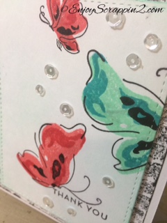 For my card base, I have a top folding A2 size card stock which is Neenah, by the way. I also cut another white card stock measuring 4″x%5 1/4″ and another cut using the MFT’s stitched rectangle die. I’m going to make my own background paper using the Obsessions Impression’s Background stamp inked up with Tim Holtz distress mini ink pad. I do have the whole collection of the full size ink pads which I still use, but sometimes the little ones are just easier. I stamped out the brick wall and put it aside and will work on our focal panel. I stamped out the Thank you sentiment using the same Alte New stamp set and I stamped out one of the butterflies using the New Cracked Pistachio and Peacock feathers. The 2nd butterfly was stamped using the New Abandoned coral and Festive berries. I also stamped out a small butterfly using the same abandoned coral. After doing so, I attached some Cartwright Moonshine sequins and added some Wink of Stella clear pens on the butterflies for the finishing touch. It’s super easy and simple but it looks like you took a while to make this card. I do have a full tutorial on my Youtube Channel with more description of this 3 step stamping. I hope you enjoyed this cad and please subscribe and follow for more inspirations and ideas. Thank you, and Mahalo:)
